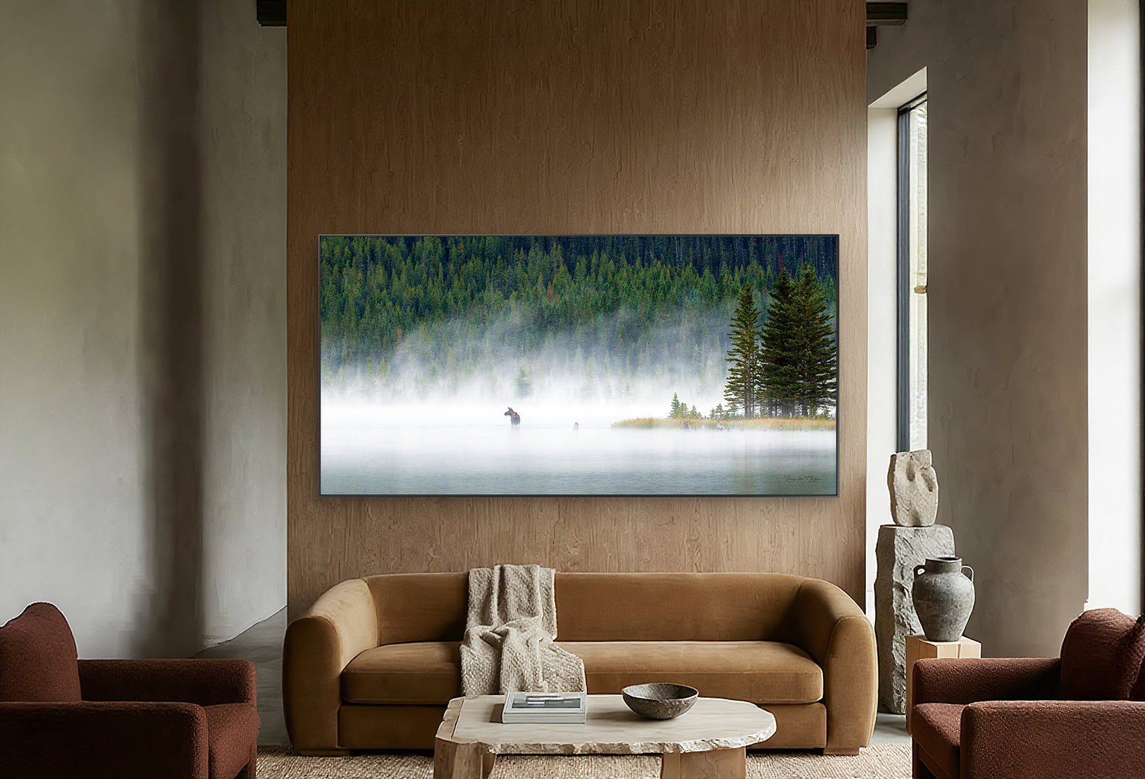 Captured in the Spray Valley near Canmore, “Misty Moose” depicts a female moose standing in a broad, shallow body of water, surrounded by rising mist that transforms the scene into something almost otherworldly. The morning light, diffused by fog, highlights her quiet strength and presence.